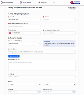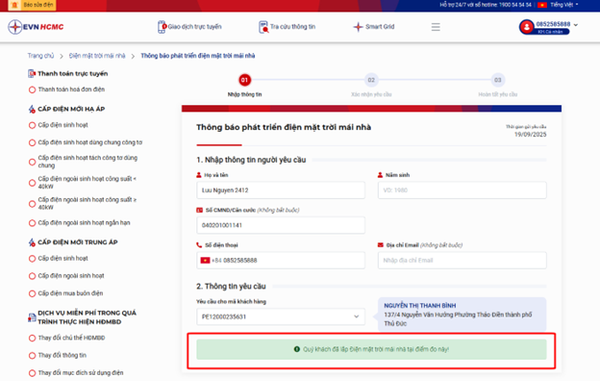 Nhằm tạo sự thuận lợi cho khách hàng sử dụng điện trên địa bàn TP.HCM có lắp đặt hệ thống điện mặt trời mái nhà thực hiện thông báo phát triển điện mặt trời mái nhà (ĐMTMN) tự sản xuất, tự tiêu thụ theo Nghị định số 58/2025/NĐ-CP, Tổng công ty Điện lực TP.HCM (EVNHCMC) đã triển khai chức năng thông báo trực tuyến trên website chăm sóc khách hàng www.evnhcmc.vn.