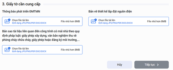 Bước 4: Tải lên các hồ sơ kèm theo (Bản vẽ thiết kế lắp đặt nguồn điện, Bản sao tài liệu liên quan đến công trình có mái nhà theo quy định pháp luật, …) theo yêu cầu của Nghị định 58.