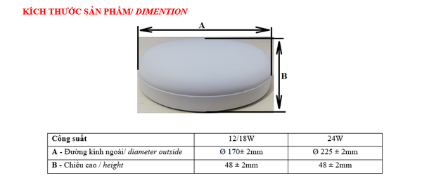+ Công suất 24W: Đường kính ngoài Ø 225 ± 2mm; Chiều cao 48 ± 2mm