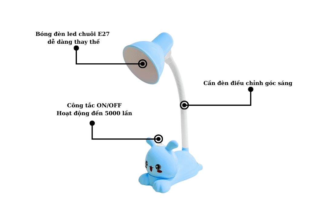 Đèn bàn ĐQ DKL21 sử dụng loại đui đèn xoắn E27 thông dụng trên thị trường, giúp dễ dàng thay thế bóng đèn khi bị hỏng. Điều này mang lại sự tiện lợi và đảm bảo rằng đèn luôn hoạt động tốt, cung cấp ánh sáng ổn định cho bé.