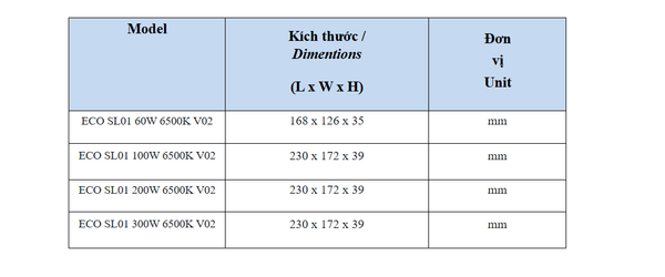| Kích thước - đối với đèn hình vuông/chữ nhật (mm) ± 2mm | |