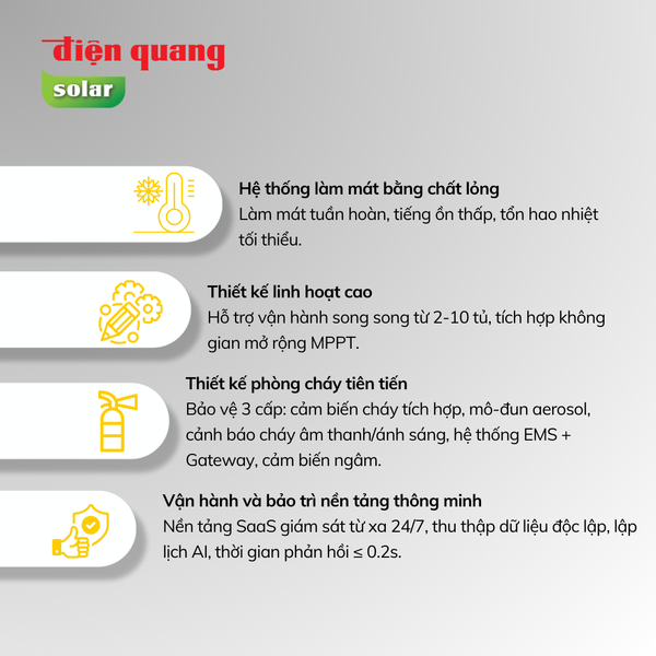 | Phương pháp kiểm soát nhiệt độ | Pin: Làm mát bằng chất lỏng; Khoang điện: Làm mát bằng gió |